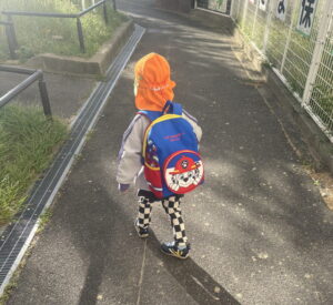 大きなリュックに水筒・お弁当を入れて張り切って保育園に向かう姿です。